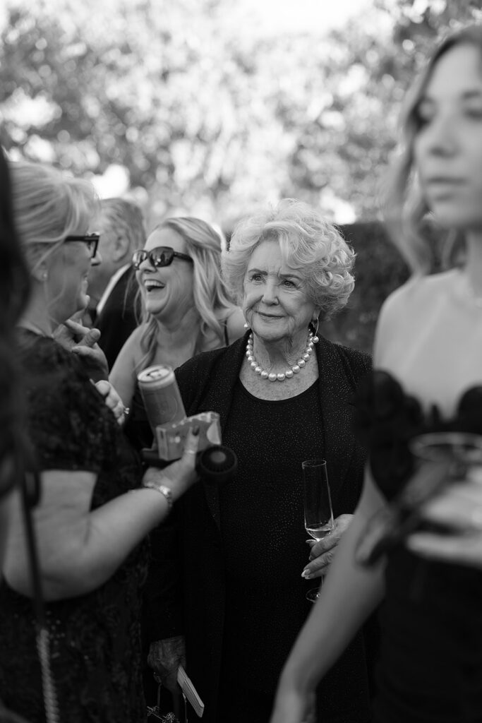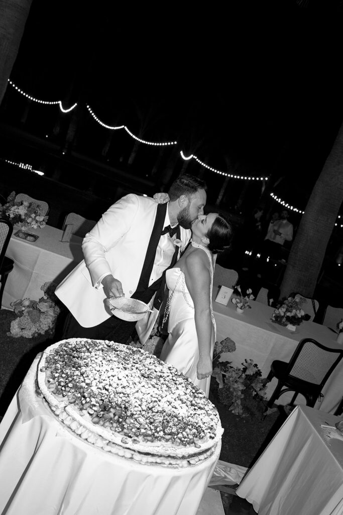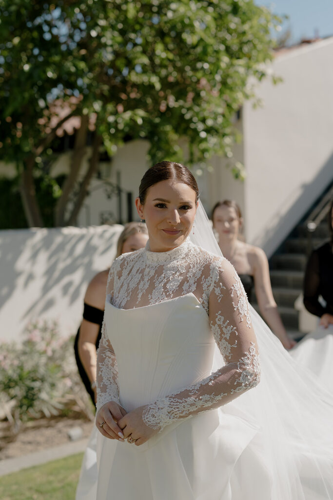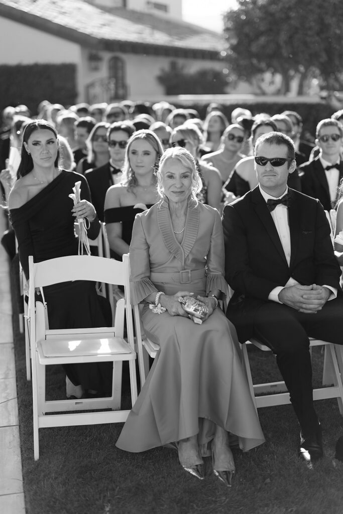The ceremony lawn at The Emerson Estate frames everything beautifully. Palm trees swaying slightly. Guests fully present.